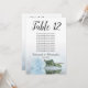 These beautiful table number cards will make it easy for your guests to find their seats at your wedding reception. They feature a simple yet elegant design with script calligraphy lettering and a single long-stemmed dusty blue or pale powder blue colored rose lying on its side reflecting in water. The card includes a seating chart with 10 names. There is also space for the couple's names and wedding date. This card is available in a variety of sizes and is larger than our standard table number cards.