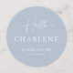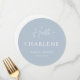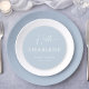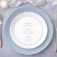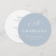 Elevate your reception tablescape with this elegant dusty blue round wedding place card featuring a personalized guest name on the front and a coordinating menu on the back.