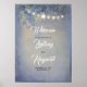 Tree branches and string of lights rustic dusty blue wedding welcome sign
