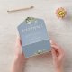 An elegant all-in-one wedding invitation featuring pretty greenery typography on a dusty blue background. The invitation includes a perforated RSVP card with your wedding website QR code. Designed by Thisisnotme©