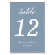 A simple wedding table number for a dusty blue wedding color scheme. It is just white text on a dusty blue background. Everything except the number itself is written in an elegant calligraphic script.