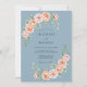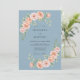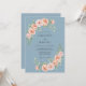 This design showcases a serene dusty blue backdrop complemented by watercolor roses in soft peach and blush pink tones. Delicate sprays of greenery and foliage create an airy, romantic feel for a springtime event. The artistic botanical elements offer a graceful and polished aesthetic. This palette evokes a peaceful and elegant atmosphere for a seasonal marriage.
