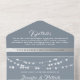 Set the tone for your special day with this rustic dusty blue wedding invitation. Featuring whimsical string lights and vintage silver floral lace accents, this all-in-one design offers a cohesive and elegant look for your celebration.