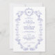 Elegant classic traditional French Victorian dusty blue toile de jouy chinoiserie style crest monogrammed charming wedding invitation.