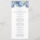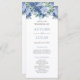 A lovely rustic wedding program featuring a lush floral top border of dusty blue watercolor flowers. The names of the bride and groom and the subheadings appear in dusty blue serif font.