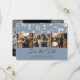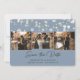 Elegant dusty blue wedding photo save the date card. Our wedding save the date features a photo collage of 3 images against a dusty blue background adorned with string lights on the front and one photo at the back. Easily personalize this dusty blue save the date card with your photos and wedding details.