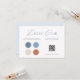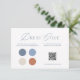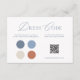Elegant dusty blue wedding dress code card featuring refined script typography and a minimalist layout. Includes a color palette guide and QR code area for additional wedding details. Perfect for modern, classic, and black-tie weddings.