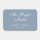 A simple wedding favor matchbox for a dusty blue wedding theme. The message The Perfect Match and the names are in elegant calligraphy i (and the date in smaller digits under the names). All text is white and can be changed.
