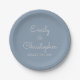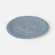Dusty Blue and white custom wedding or reception dinner paper plates. The text of the dusty blue simple and elegant plates can be updated and customized with your name and wedding date.