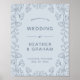 Dusty Blue Wedding Poster. Romantic and timeless, this dusty blue wedding poster features vintage line art floral roses and peonies arranged in a chic frame that can be used for any wedding season. Add a touch of modern and classic elegance to your special day with this stylish and beautiful wedding sign. Navy text on a blue gray background.