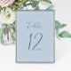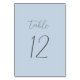 Modern, minimalist wedding table number card features a dusty blue background and romantic script font. Create as many table numbers as you need by changing the "12" to your desired number and add 1 item to your cart. Repeat for as many table numbers needed with the easy to edit template. Check out matching items in the “Blue Eucalyptus” collection.