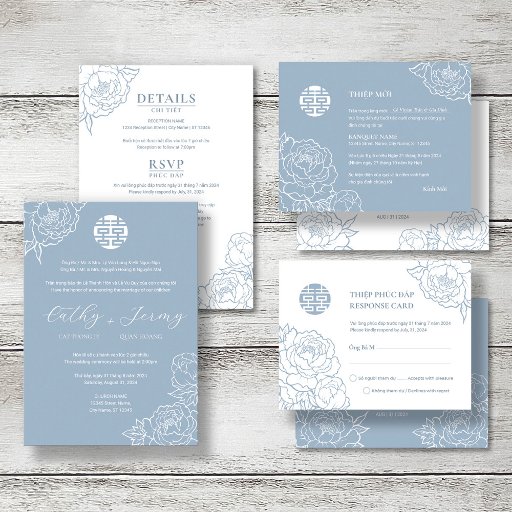 Vietnamese Dusty Blue Peony Line Art Wedding SetDesigned by Tracy T