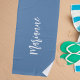 Dusty blue background. Personalize and add your name. White colored handwritten style script.