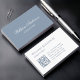 On the front, the background is dusty blue, the text is white and the name is written in an elegant calligraphic script. On the back, the background is white, the text and the QR code left of the info are blue.