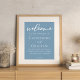 This dusty blue table welcome sign exudes tranquility for a summer coastal wedding by the sea. Personalize this light grey blue decor with elegant minimalist white typography to match your serene bridal color scheme.