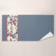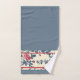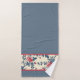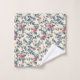Beautiful dark dusty blue with printed Toile De Jouy accent of blue vines, red rose buds and large red roses. It's lined in a coordinating red stripe. It will bring a timeless and sophisticated look to your bathroom. There is a personalized set in the shop that coordinates too, so you can mix and match the towels. The hand towel is the same design as the bath towel and the face cloth is just the floral pattern.