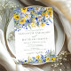 Bohemian romantic watercolor wildflowers design in cobalt and dusty blue with sunny bright yellows and whites. This wildflower watercolor design is perfectly suited for Spring or Summer weddings with a Semi-Formal to Casual-Chic vibe, ideal for Garden, Bohemian Chic, or Rustic settings that emphasize joyful, natural elegance and an atmosphere reminiscent of a sunny wildflower meadow.