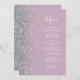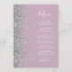 The left-hand edge of this elegant modern wedding menu features a faux silver glitter border. The customizable text combines white whimsical handwriting script and copperplate fonts on a dusty lilac background. The reverse side features a matching lilac and silver glitter design.
