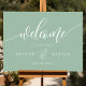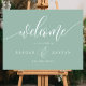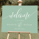 Greet your guests with understated elegance using this beautiful dusty mint green wedding welcome design. The piece features a modern, flowing "welcome" script in white, paired with a sophisticated serif font for the couple's names and wedding date. Its soft, muted green tone provides a calming and romantic aesthetic that perfectly complements garden, woodland, or coastal wedding themes. This high-impact design is a wonderful way to personalize your ceremony or reception entryway, creating a polished and inviting atmosphere for your special day. The clean, minimalist layout ensures your details remain the central focus while adding a professional touch to your event decor.
