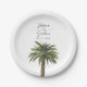 A unique palm tree-themed set of paper plates tailored specifically to your future wedding on the beautiful coast or island. They feature a minimal style illustration of a single palm tree. Above this rest the unique names of the bride and groom in an elegant cursive style font.