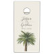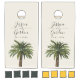 A unique palm tree-themed set of cornhole boards tailored specifically to your future wedding on the beautiful coast or island. They feature a minimal style illustration of a single palm tree over a tan sandy color backdrop. Above this rest the unique names of the bride and groom in an elegant cursive style font.