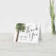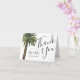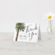 A beach inspired wedding Thank you card featuring a watercolor image of a single dusty palm tree. On the side of it are your unique details.