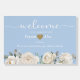Elegant dusty/pastel blue, cream, and white watercolor floral Engagement party 30"x20" landscape formatted "Welcome" sign with a gold heart. Personalized with the name of the bride and groom-to-be and their party date. Add your own message to the bottom or keep ours. Contact me for assistance with your customizations or to request additional matching or coordinating Zazzle products for your event(s).