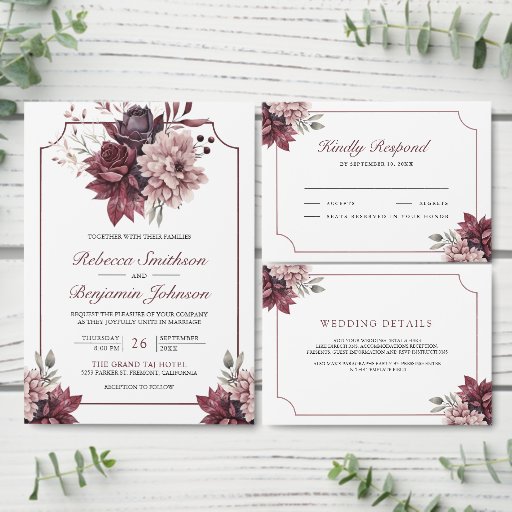 Dusty Pink Burgundy Floral Frame QR Code Wedding Tri-Fold Invitation