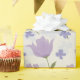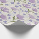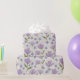 This wrapping paper features a pattern of dusty purple colored flowers with green leaves set against a cream or ivory colored background for a pretty and modern look.