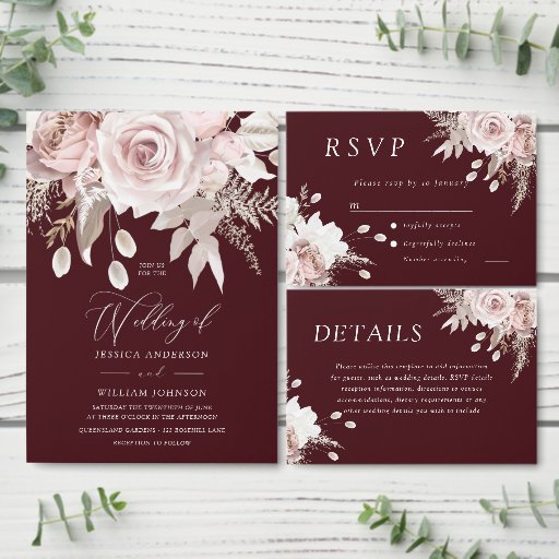 Divine Dusty Rose Blush Floral Wedding All Event Deep Burgundy RSVP Card