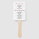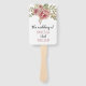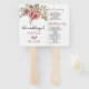 Beautiful watercolor floral bouquet with dusty rose pink flowers and succulent leaves, script typography floral fall wedding program hand fan. A bouquet of pink cactus flowers and green succulent leaves adorns the upper part.