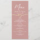 Elegant and modern dusty rose wedding menu featuring chic white typography, a romantic gold rope heart motif, and a clean layout. Perfect for weddings with pastel, minimalist, or pink and gold themes. This design suits spring, summer, or fall receptions and adds a refined touch to your table decor. Fully customizable with your meal details and wedding date.