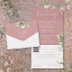 All in one dusty rose wedding invitation featuring botanical greenery, rustic leaves and elegant typography. The invitation includes a perforated RSVP card with your wedding website QR code and details. Designed by Thisisnotme©
