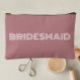 Solid dusty rose color, small style, zippered cosmetic bag for your wedding bridesmaid that features the word, BRIDESMAID in large, modern typography on one side of bag. Perfect as a travel accessory pouch to hold makeup, perfume, and jewelry. You may personalize by adding bridesmaid name if desired to pouch. Available in many, popular bridesmaid wedding theme colors.