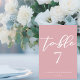This dusty rose pink wedding table number features delicate white typography for a romantic afternoon ceremony for a feminine bride who likes soft colors and minimal script design. Soft pastel pink reception decor.