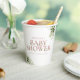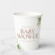An elegant baby shower paper cup featuring chic dusty rose pink typography and pretty botanical greenery foliage. Designed by Thisisnotme©