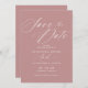 Simple and elegant save the dates featuring "Save the Date" text in a vintage-inspired script. Muted mauve-pink color background.