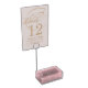 This dusty rose pink wedding table card holder features delicate white typography for a romantic afternoon ceremony for a feminine bride who likes soft colors and minimal script design. Soft pastel pink reception decor.