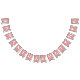 A simple bunting flags banner for a dusty rose wedding, with the names of the bride and groom, with white caps on dusty rose pink background.