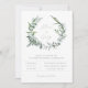 Beautiful watercolor dusty sage botanical foliage wreath, wedding invitation. Modern and chic grey and sage typography design. Back of card features solid color shown in dusty sage green, which can be customized.