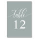 Enhance your wedding reception with understated elegance. These minimalist table numbers feature a single word, "Table," in delicate calligraphy script on a soothing dusty sage background. The simple yet refined design adds a touch of sophistication to your table setting, allowing your floral arrangements and other décor to shine.