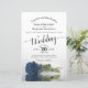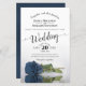 This beautiful budget or affordable wedding invitation features a romantic design with a single long-stemmed steel or dusty blue colored rose laying on its side and reflecting in a pool of water. The typography features lacy script calligraphy and a sophisticated layout. The back is a marbled blue gray color. Wonderful way to invite your friends and family to share in your joy on your special day.