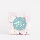 Punny wedding favor stickers feature "mint to be" in white hand lettered script accented with hearts, on a dusty teal aqua background. Personalize with your names and wedding date.