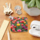 The key chain is made of metal and really sturdy. The flower design is really cheerful. The logo and colors are clear and crisp!