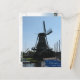 A Dutch windmill silhouette against a blue sky with a row of small sailing boats and masts lined up in the canal with reflections of the sunlight in the water during summer time in the Frisian town of Woudsend photo postcard. The windmill is a saw mill and is named "De Jager" ("The Hunter") and was built in 1719. This saw mill is one of three left in Friesland, Fryslan, the province in the North of The Netherlands. This Holland Frisian photo card is fully customizable! add your text or images!