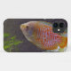 The original photograph on this case shows a Dwarf Gourami fish swimming in an aquarium. This colorful tropical fish has an orange body with vertical stripes that look iridescent light blue in sunlight. Green leaves of an underwater plant can be seen in one corner of the photo, part of a large seashell in another corner behind the fish, and the background is a textured medium gray.