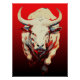 The fiery red tones that dominate the background evoke a sense of passion, energy, and movement, emphasizing the bull's dynamic nature. The play of light and shadow adds depth and dimension, making the image come alive. The bold strokes and fiery palette create an artwork that is both modern and timeless, appealing to those who appreciate strength, motion, and dramatic compositions.