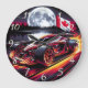 A sleek hot rod roars with flames, racing along a dark road beside a tranquil lake, illuminated by the full moon and accompanied by a Canadian flag.
