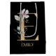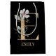 Letter E monogram floral. Letter E in golden brown texture accented with green watercolor compound leaves, flower blossoms and gold dust. Personalized with name in matching font.