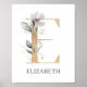 Letter E monogram floral. Letter E in golden brown texture accented with green watercolor compound leaves, flower blossoms and gold dust. Personalized with name in matching font.